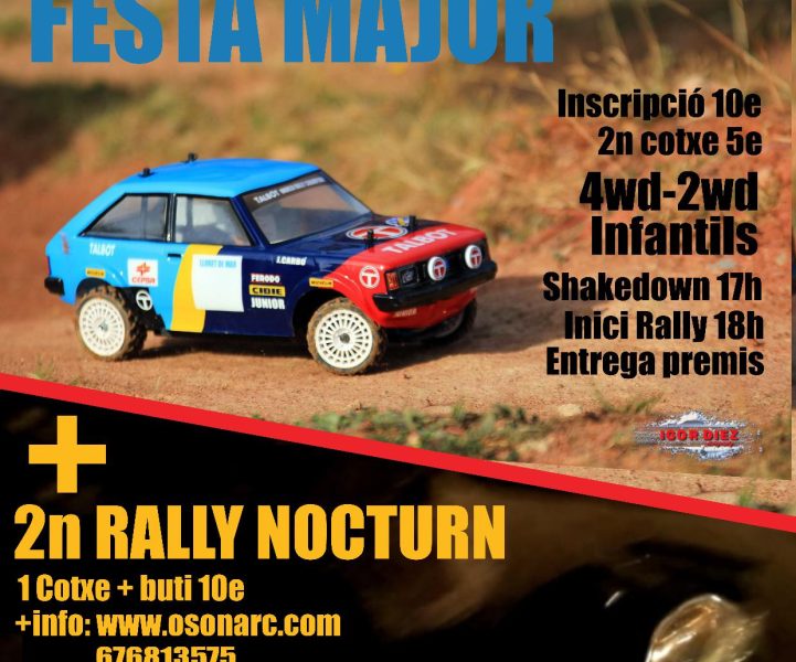 El dissabte dia 13 es va realitzar el 2on RALLY FESTA MAJOR al circuit de Vilanova de Sau. Guanyadors cat. 4WD: 1er Jordi Carbó 2on Robert Farré 3er “Bere” Guanyadors 2RWD: 1er “Chicho” 2on Robert Farré 3er Josep Carbó Guanyadors INFANTIL: 1er Blai Calvo 2on Tian 3er Martí