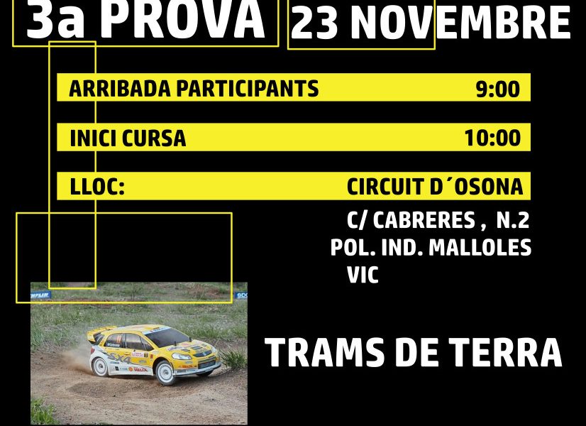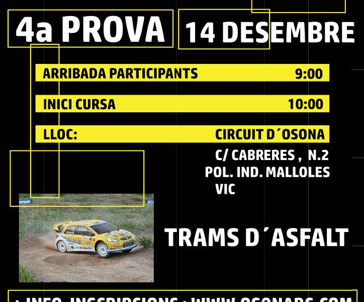 Diumenge 14 de Desembre es disputarà la 4ª i última prova puntuable per el 1er Campionat de Osona de rallis radiocontrol a les instal.lacions del Circuit d´Osona, al C/ Cabreres , nº2 del Poligon industrial Malloles de Vic.